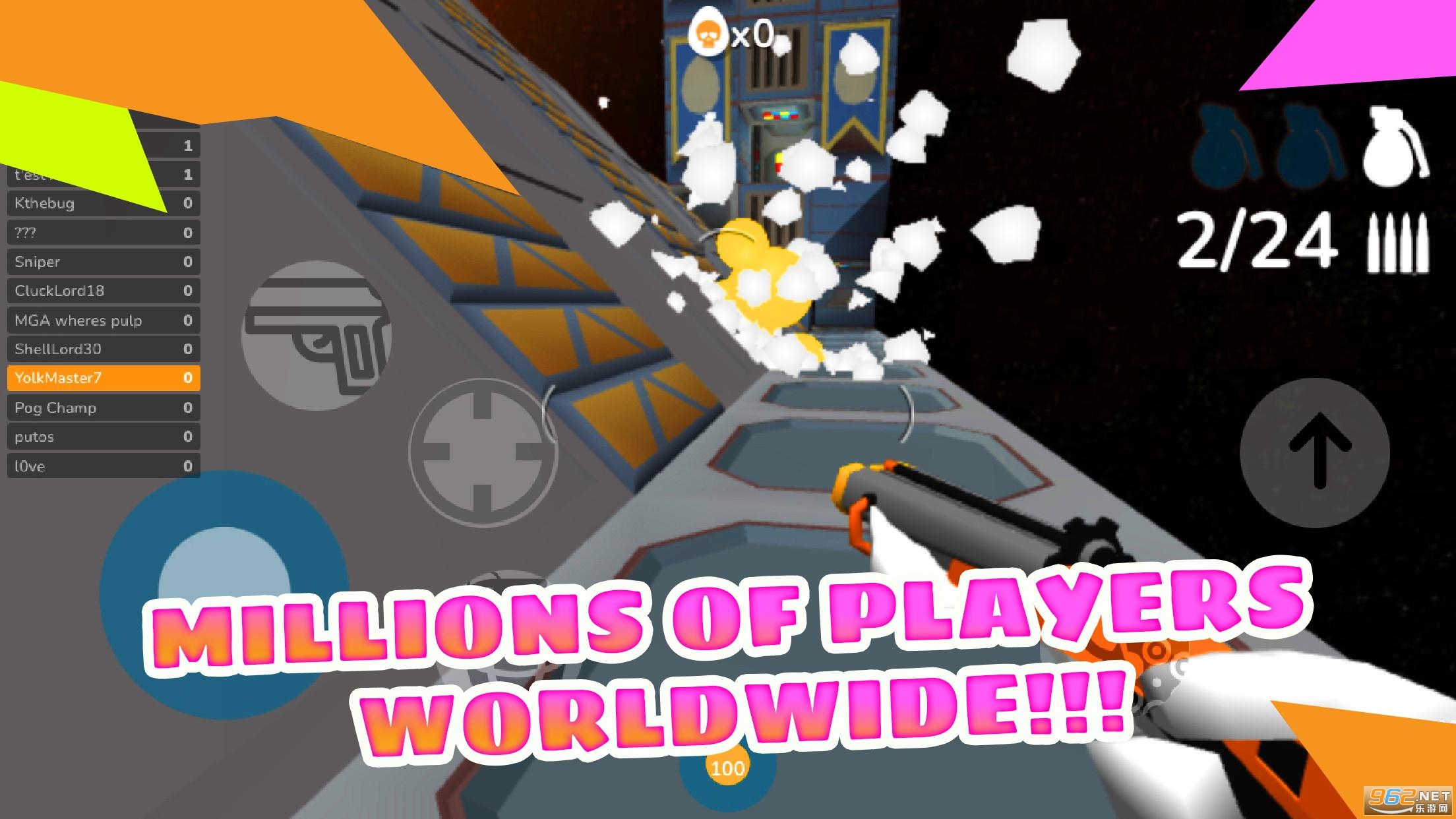 上玩使用八种不同的武器装备:Crackshot、Scrambler、Tri-Hard、Whipper、Free Ranger、Cluck 9mm 和 Eggk47。然后用疯狂的帽子、皮肤、颜色和贴花定制你的蛋蛋,然后再与你的对手战斗!