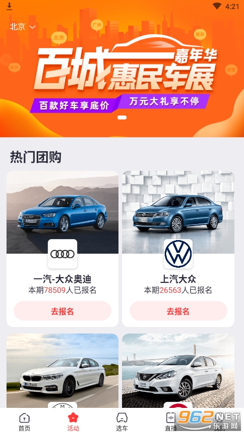 1、车展报名:还在发愁没时间去看车?团车举办的惠民团车节帮助您以团购的价格,车展的形式购买新车及汽车周边用品。