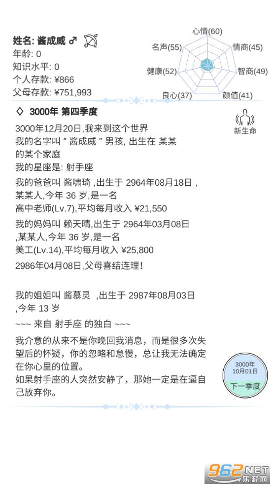 模拟人生路破解版是一款文字剧情养成游戏,在这款游戏当中,玩家所要扮演的是一名小孩子,从出生到上学再到结婚生子,最终悄然死去,这一切的一切都由玩家来进行安排,享受高自由度的另一端人生,是成为一个成功者还是默默无闻,全都由你决定。
