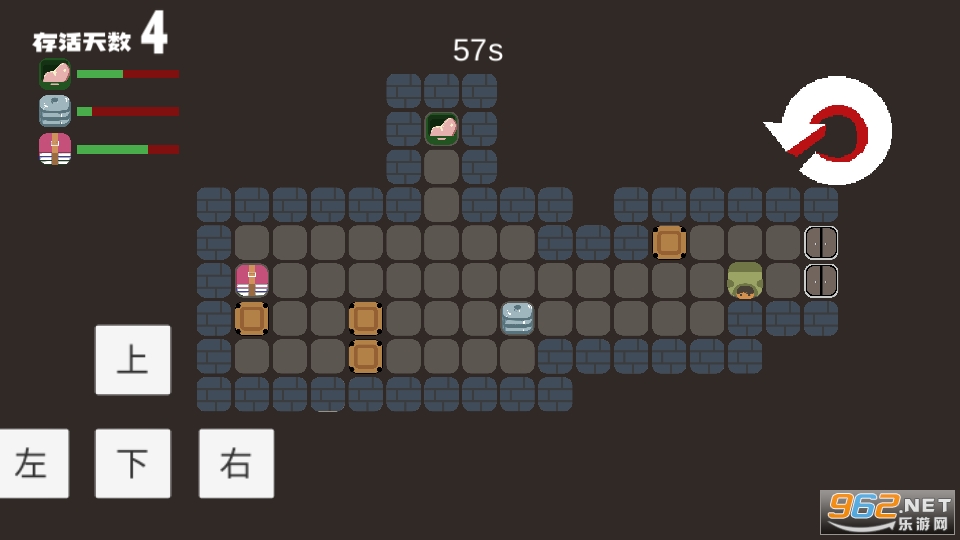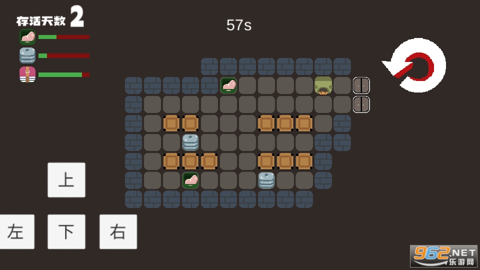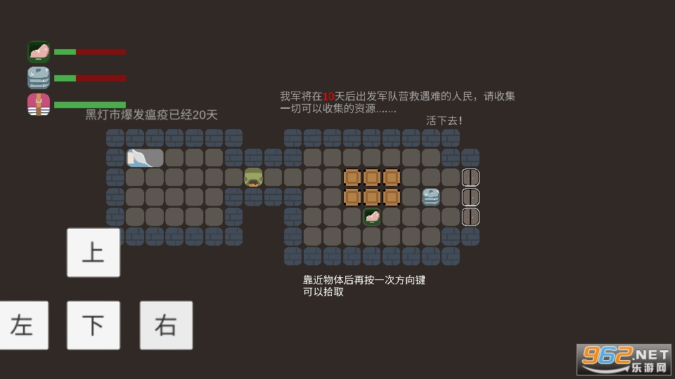 操作指南:上下左右控制移动,靠近物资后按对应方向键”顶“它一下,就可以携带物资,携带的物资就不可以再次抛弃,同时携带越多的物资也可以扩展你接触的范围,以及更难的移动.......