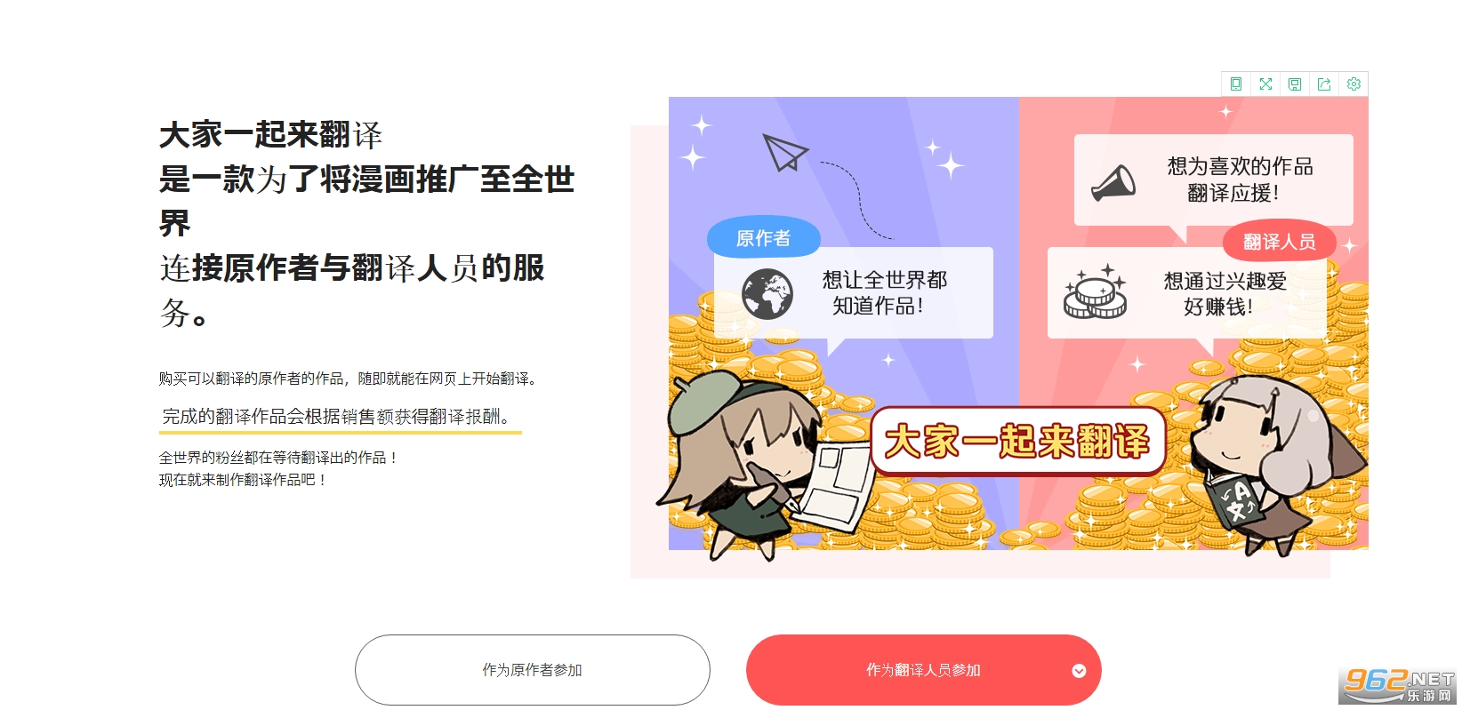 翻译人员可通过浏览器进行翻译,无需任何专业软件。当翻译版作品售出时,创作者和译者便可收到相应的报酬,翻译者还可以义务翻译,将报酬返还给创作者。