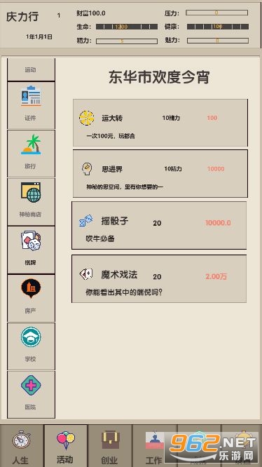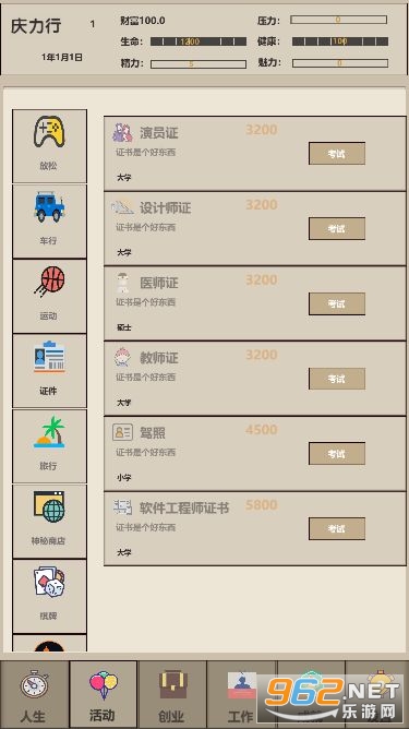 下来我来介绍游戏的玩法,主题为模拟人生的生死线,游戏中包含了你出生到死亡的完整生命,你会学习各种各样的技能,上不同的学校,从幼儿园到博士毕业,你会参加中考,高考,研究生考试和博士考, 你应尽量提升自己的学习成绩,以考取更好的学校,如果你有钱,也可以选择更好的贵族学校,但如果你家境贫寒,你可能需要勤工俭学来弥补自己的学费和生活费。