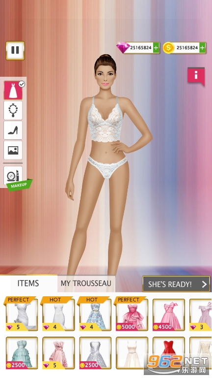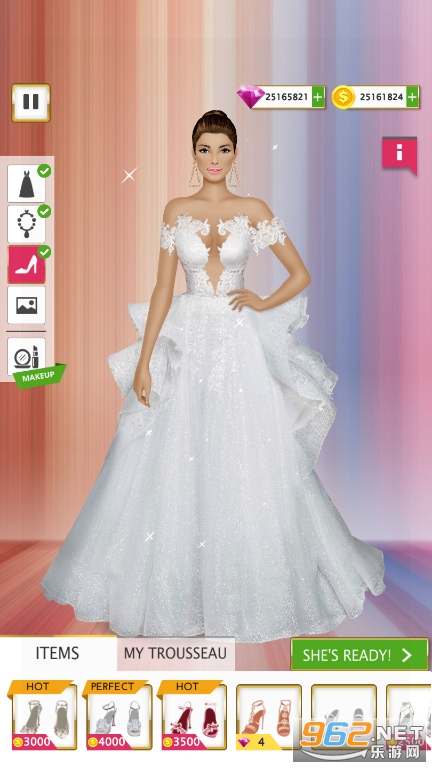 1、选择你喜欢的新娘角色,给她搭配好看的婚纱,设计精美的发型;