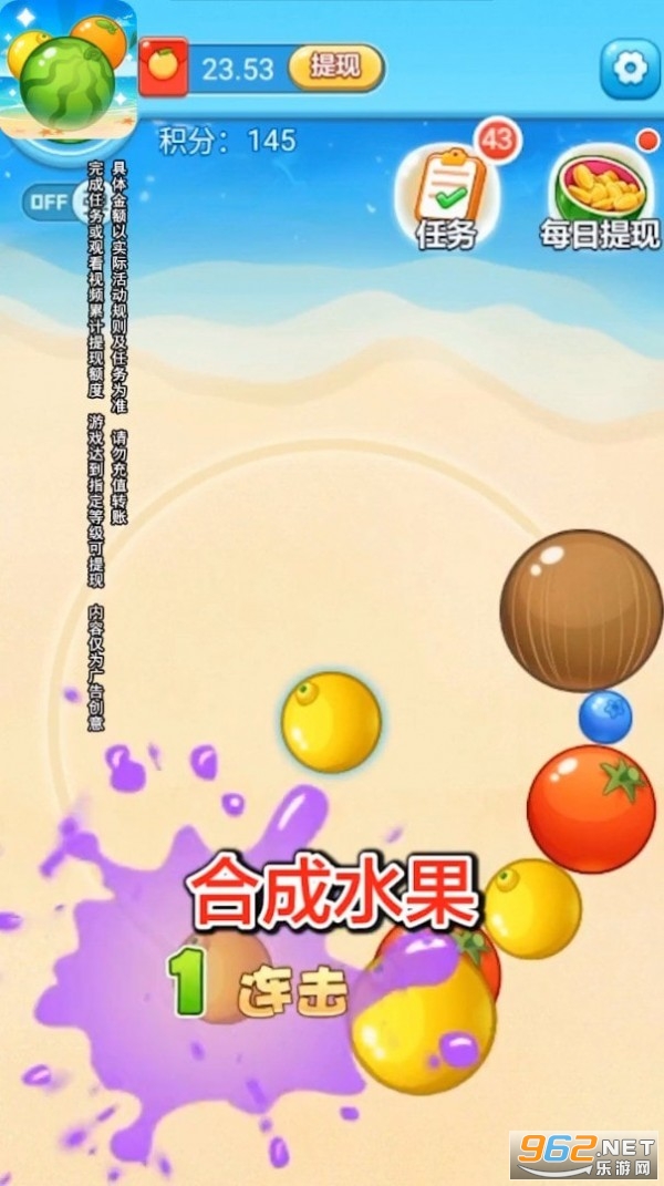 3、水果合体展示你的技巧,消除的任务福利多多,将快速的开始真实的挑战任务。
