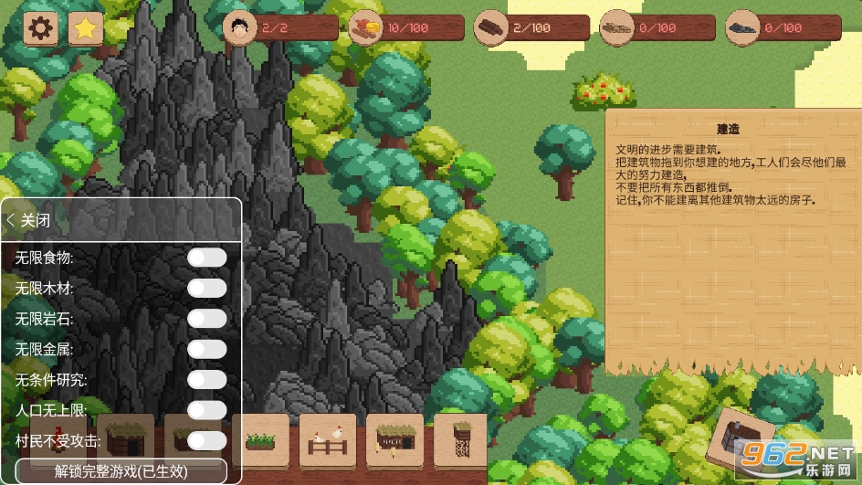 作弊菜单:无限食物,无限木材,无限岩石,无限金属,人口不上限,无条件研究,村民不受攻击,解锁完整游戏