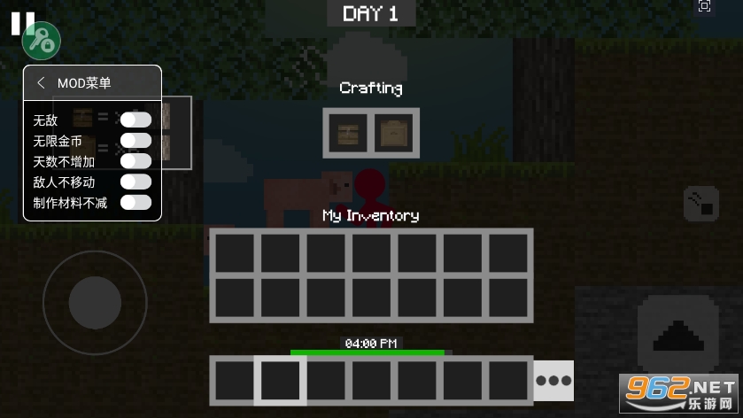 辅助菜单:无敌,无限金币,天数不增加,敌人不移动,制作材料不减