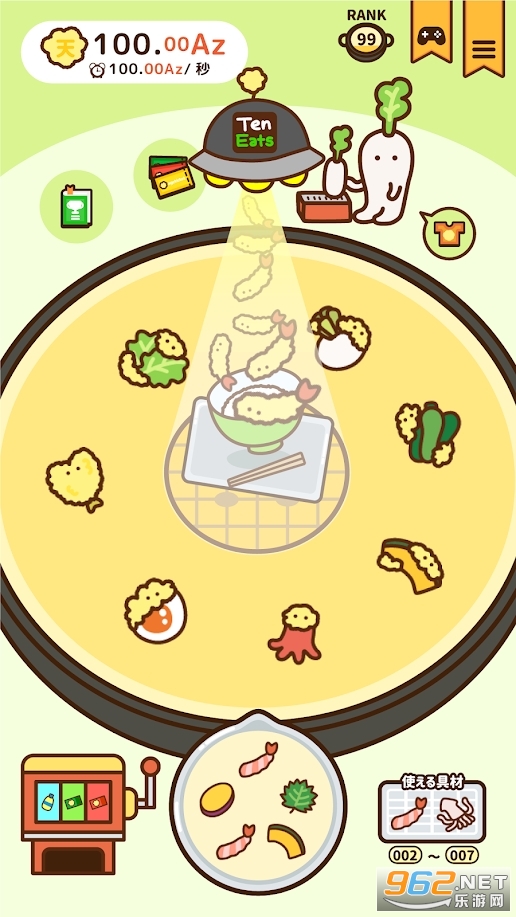 玩家将原料浸泡在天妇罗粉中,然后将其放入装满油的平底锅中,就可以制作出,还可以用罐子里产生的能量中购买新的食材。
