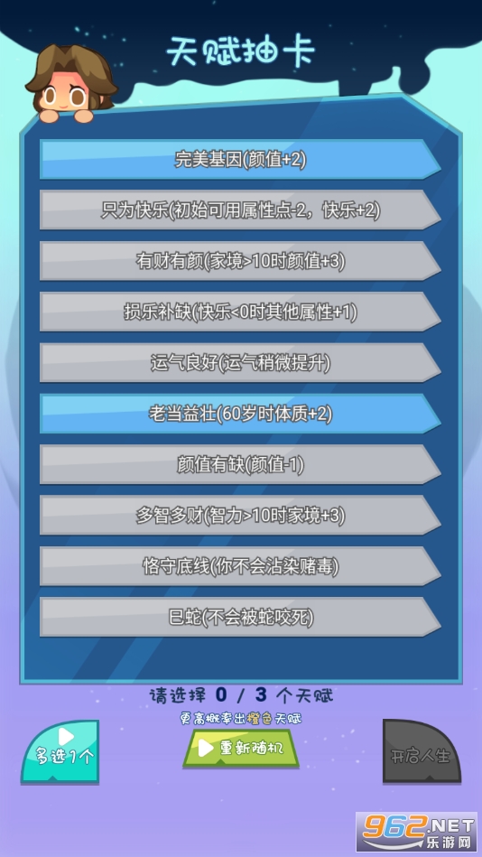 1.在游戏开始前,玩家可以随机获得各种不同的属性,你可以根据属性合理选择,开启不同的人生。