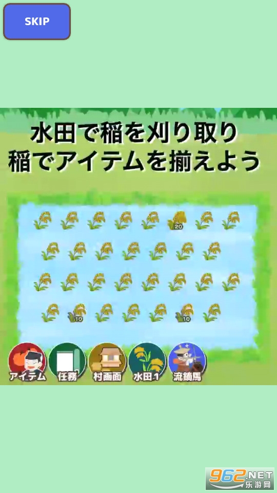 水稻自己生长,什么也不做。种植的水稻通过敲击或滑动收获。稻谷收割时,收割在米袋中,累积稻谷积分。
