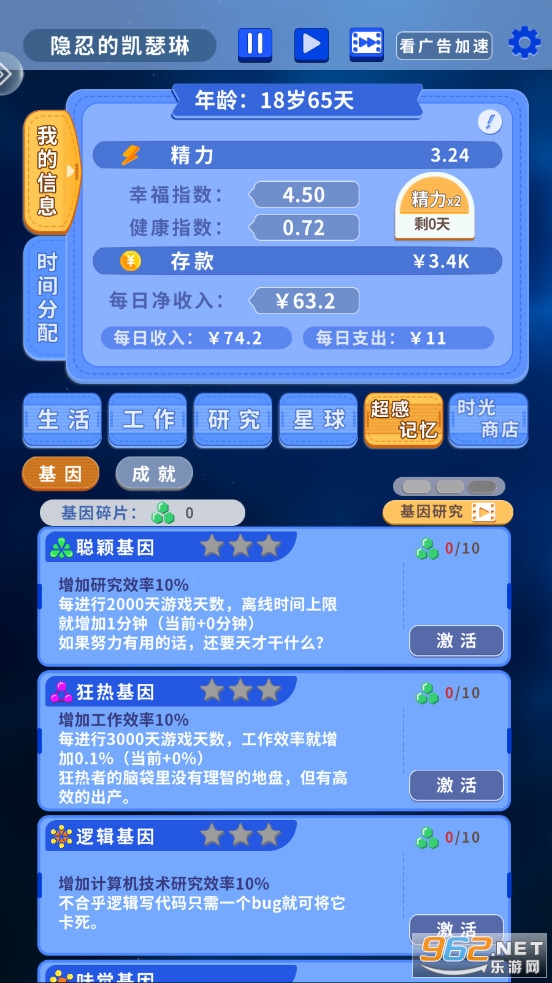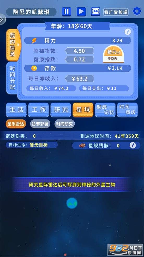 一款有趣的人生模拟游戏,在未来人类将被外星人消灭,在偶然之下你穿越回了过去,你需要努力的获得各种资源,研究出对抗外星人的方法,游戏的操作简单容易上手,推荐给喜欢休闲游戏的玩家。