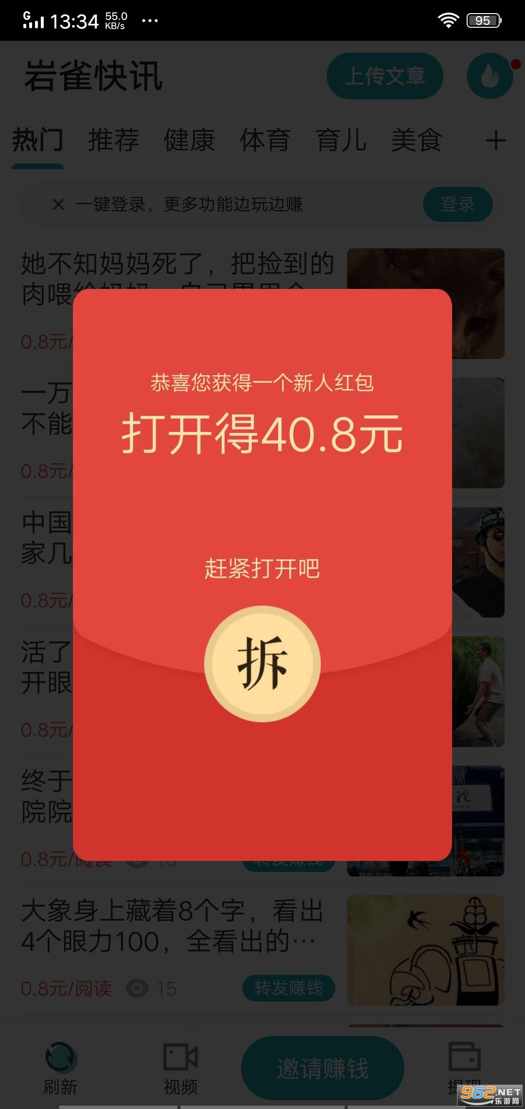喜鹊快讯APP是章鱼快讯旗下继金马快讯之后又推出的一款转发文章赚钱平台!新人下载安装喜鹊快讯送0.92元,软件上更新了新闻、健康、搞笑、科技、美食等文章,转发至您的群或朋友圈,好友点击就能挣钱,单价全天保持3-5毛/点击,点击人数越多,赚钱就越多,真实涨分,永久8元提现门槛!