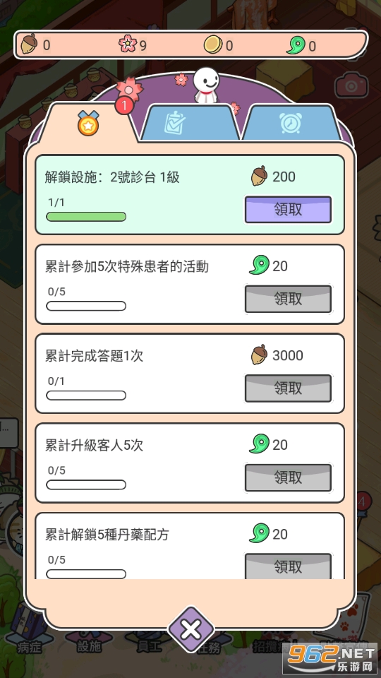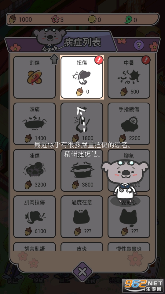 增加一个咨询台可以诊断更多的病人,设置一个药浴可以让病人洗澡。促进医院整体发展,解锁特殊动物!赶紧建个院子,营造欢乐的气氛。