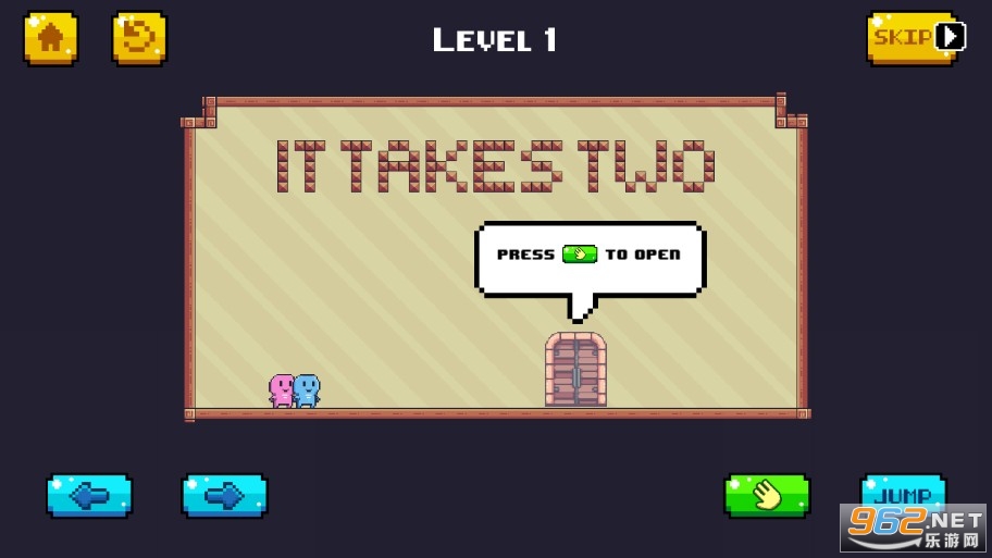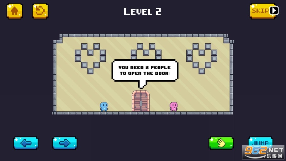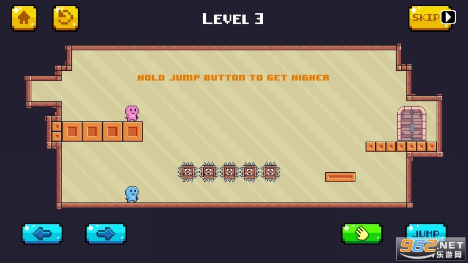 大家需要注意的是,我们在点击跳跃键时,是同时控制两个卡通小人一起跳跃的,所以不要出现任何意外,让他们其中的任何一个触碰到机关或者落入陷阱,要让他们安全无恙的来到大门前,只有聚在一起才能打开大门。