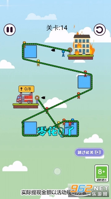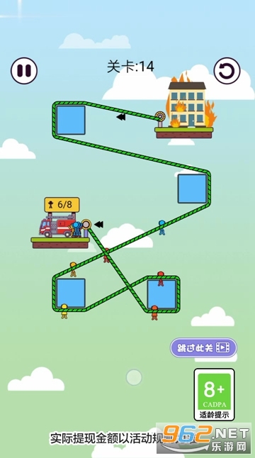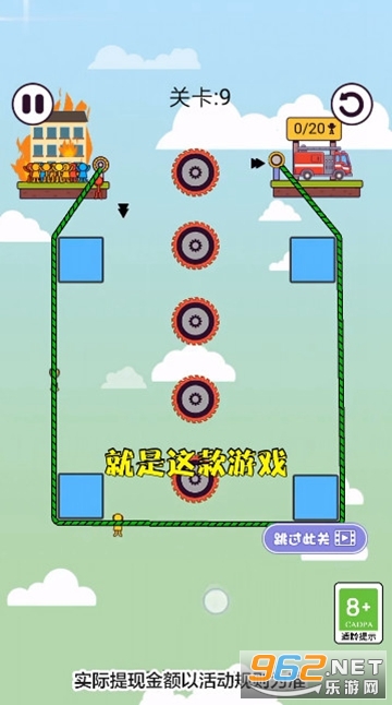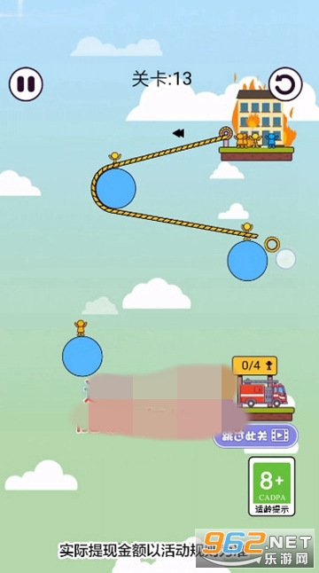 《100大闯关游戏》是一款画面清新的闯关救援类休闲手游,游戏中玩家的任务就是救助被火灾困住的人,一栋房屋着火了,困住了一些人,玩家需要利用绳子和一些固定点来让这些人沿着绳子滑动到另一处安全的地方,有着丰富的场景和关卡可以挑战。