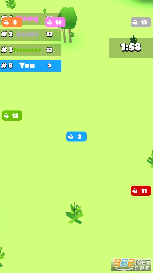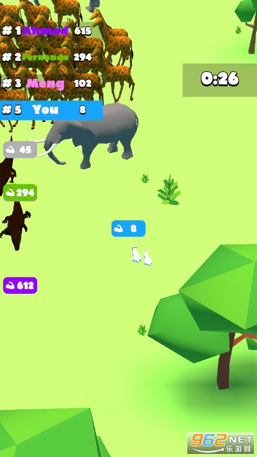 《拥挤森林百兽之争》(Crowd Forest.io - Herds Battle)是一款多人在线欢乐竞技游戏,玩法类似《拥挤城市》,玩家扮演一只兔子,在游戏中灵活的移动,寻找食物,增加人群数量,躲避比你强大的队伍,吞噬数量比你少的动物群,活到最后,争夺名次!