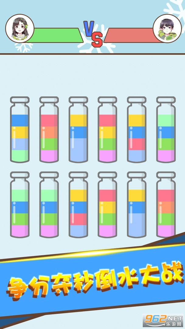 《水排序对战》是一款好玩的水排序谜题游戏,水排序谜题段位赛火爆来袭,系统会快速为大家匹配段位实力接近的玩家,一起来进行水排序吧,将相同颜色的水导入进一个杯子中,完成所有颜色水的排序才算成功,争分夺秒千万不要浪费时间,要抢先完成挑战,才能得到更多的奖励。