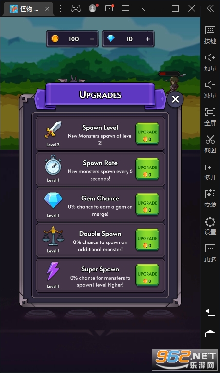 《怪物VS猎人快速升级版》(Monsters vs Hunters)是一款全新玩法的趣味对战休闲放置游戏。采用了卡通精美的画风设计,加入了合成和放置,策略对战等玩法,玩家需要不断的合成升级怪兽,搭配不同阵容,抵抗猎人的进攻,守卫家园!