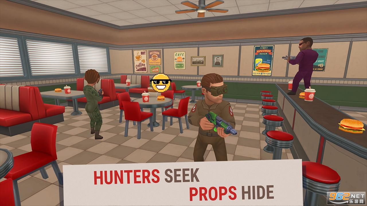 作为道具躲在任何房间的其他玩家面前或尝试逃跑!只需交换并变成任何类型的隐藏物品 - 椅子、盒子、杯子,甚至是盥洗盆。