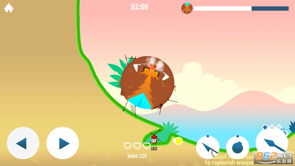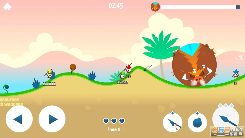 《Tiny Hunters安卓版》是一款横版卡通可爱风休闲竞技游戏,玩家在游戏中扮演一个非常小的小人,在游戏中和其他的两位玩家相互合作,利用投矛、炸弹和绳索矛三种武器,击败怪物,赢得胜利。每个人拥有三条生命,你需要寻找合适的位置,躲避怪物来回滚动,对你的攻击!