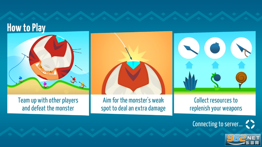 比较好玩的竞技游戏,玩法超级轻松,很容易上手,画风看起来十分的精美,玩家们在游戏里面使用三种有趣的武器去攻击巨人怪物,与其他的玩家合作完成任务,每局有三次机会,节奏感很快,喜欢游戏就来下载吧!