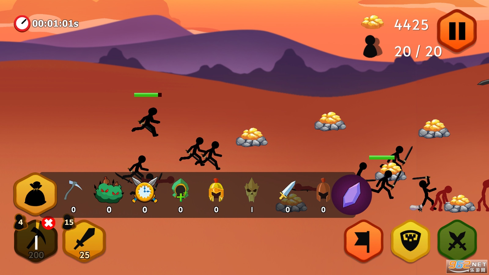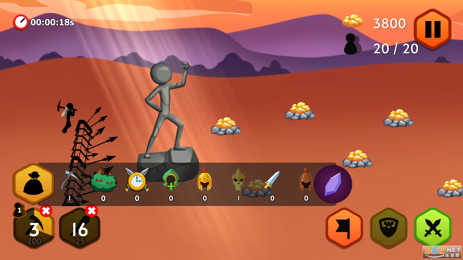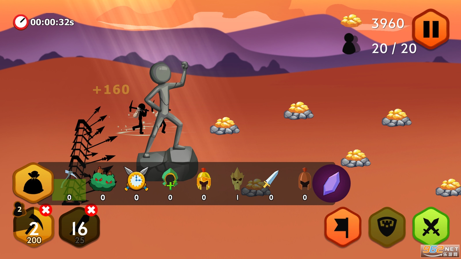 2、多种兵种等待你用金币解锁:矿工,剑士,弓箭手,重装步兵,巫师,奴才,弹射器,箭塔