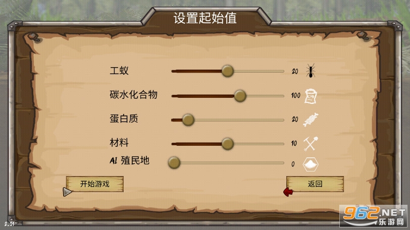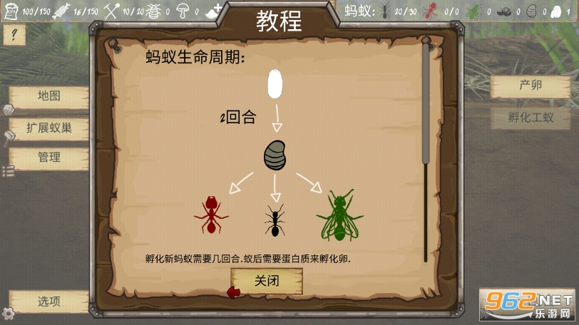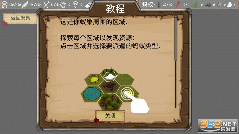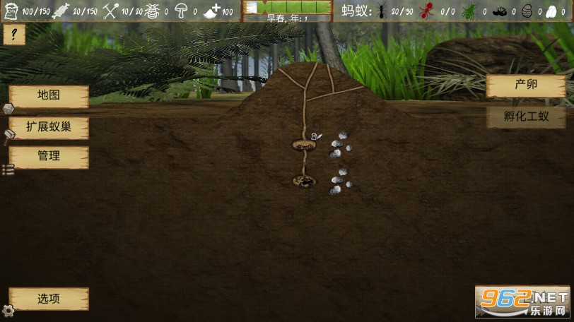 一开始蚁群只有几个工蚁和王后。你的目标是发展足够大的蚂蚁窝!