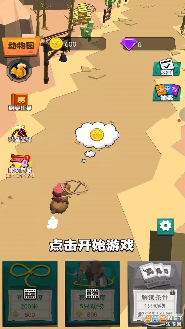 一款动物园养成类游戏,玩家扮演驯兽师的角色,通过套索套住不同的动物,解锁新动物,放在动物园里供游客观赏获得收益,不断驯服更多的动作,去掌握更多驯兽方面的技巧。