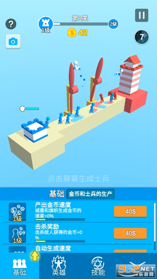 《全都给我上》是抖音上面很火的一款红蓝小人占领塔的游戏,画风比较的简约,采用了放置系的玩法模式,玩家在游戏中需要通过点击的形式控制蓝色的队伍,不断地派出士兵,朝着地方的塔楼发动攻击,合理的搭配英雄,不断地进行升级,你才能顺利的完成任务,感兴趣就来试试!