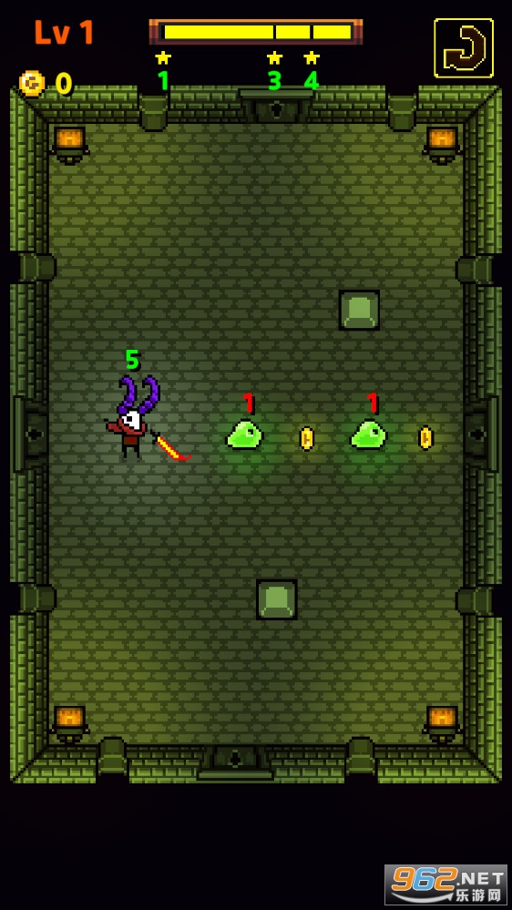 行云流水般的斩击速度,地牢中的魔物是我们最最熟悉的史莱姆怪物,控制好你的山羊剑斩角度以及方向就能够完成以上操作,角度找的非常得好的话,你通关也会获得三星评分以及丰厚的金币奖励!