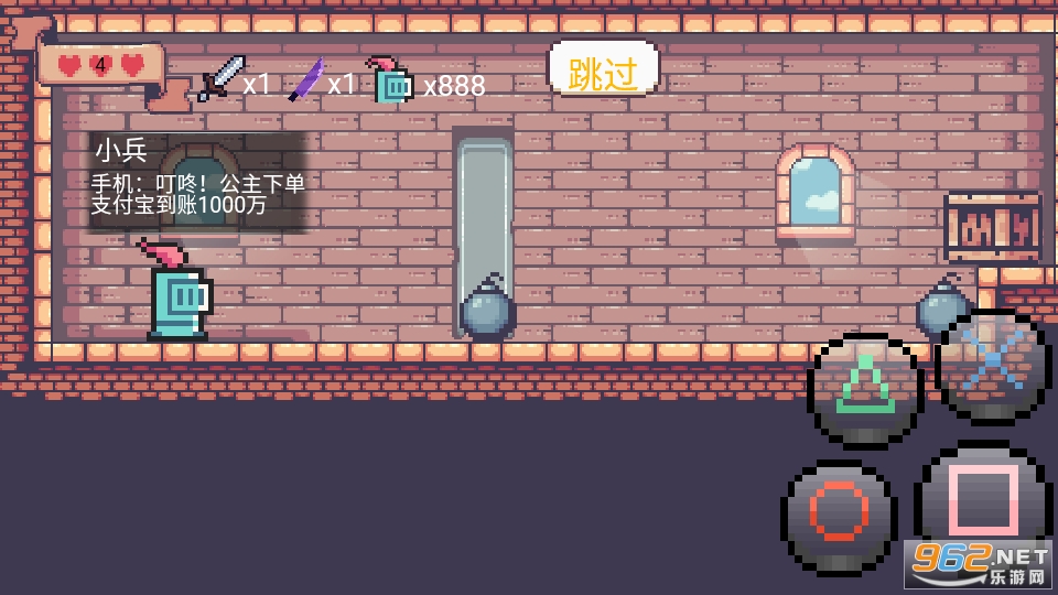 扮演小兵踏上拯救公主的赚钱道路,本来小兵是不想救公主的,但是已经收到了公主的支付宝转账就不太好拒绝了,帮助小兵顺利的到达猪国拯救公主吧!