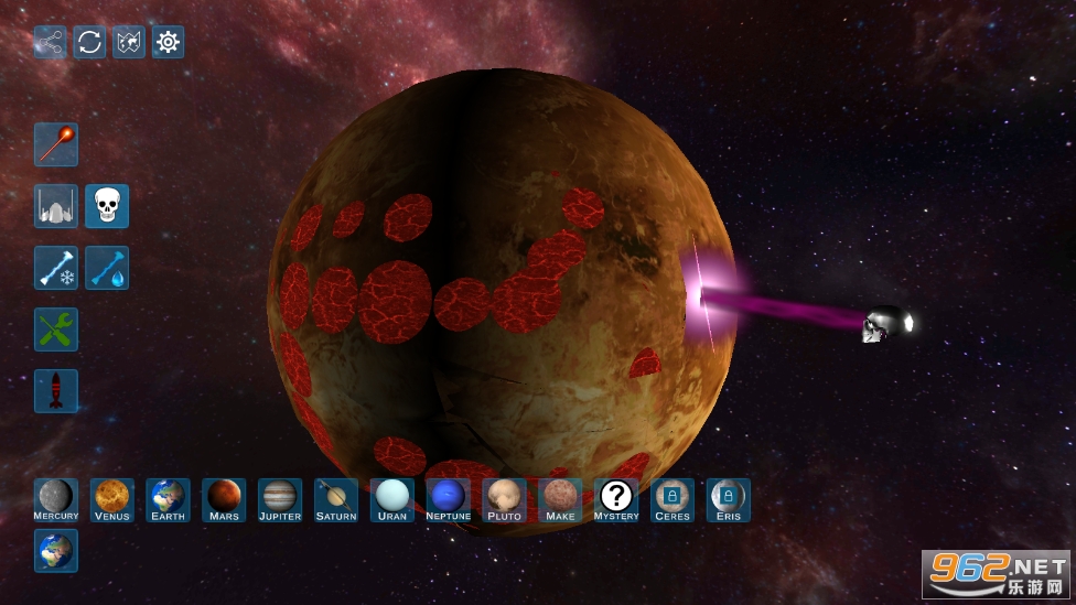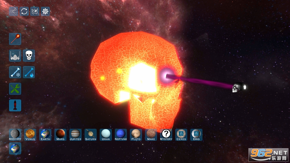 《Solar Smash2隐藏星球》是一款非常好玩的星球毁灭模拟器游戏,游戏名字也叫《行星破坏模拟器2》,游戏中拥有地球,火星,水星,金星,月球等众多的星球和隐藏的星球可以让玩家来自由解锁,使用激光,火箭,骷髅和外星生物等武器去摧毁这些星球,看着它们一点点被粉碎!