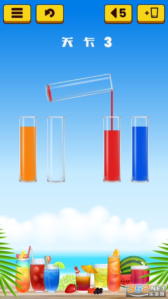 2.游戏内包含了不同的模式,供玩家自由的进行游戏,玩家可以根据果汁水的颜色然后倒起来,有点复杂的,如何正确的闯关是看玩家自己的。