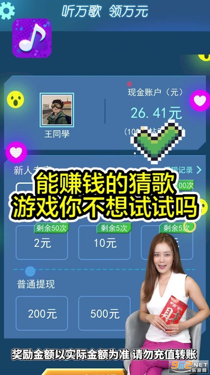 《猜歌红包群》是一款最新推出的猜歌赚钱网赚游戏,画面设计非常简约没有任何广告,下载安装好立马就能玩,用户们根据听到的曲子猜出正确的歌名就可以继续后面的关卡,正确猜出的歌名越多得到的红包奖励也就越多,如果你想玩这款好玩的猜歌赚钱游戏的话就赶快点击下载吧。