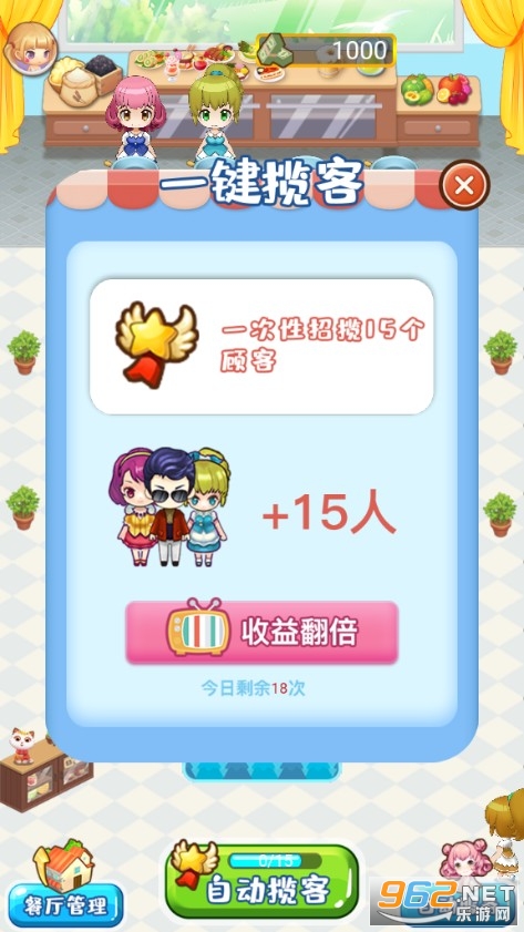 《吉祥餐厅》是一款可以赚红包的餐厅经营游戏,餐厅管理完成任务收获红包奖励,每天都会有各种各样的任务等着你去完成,认真的完成任务就能得到超多红包福利,使用获取的金币不断升级我们的餐厅,置办更多餐桌和餐具,还可以招募服务员厨师,让餐厅的规模越来越大。