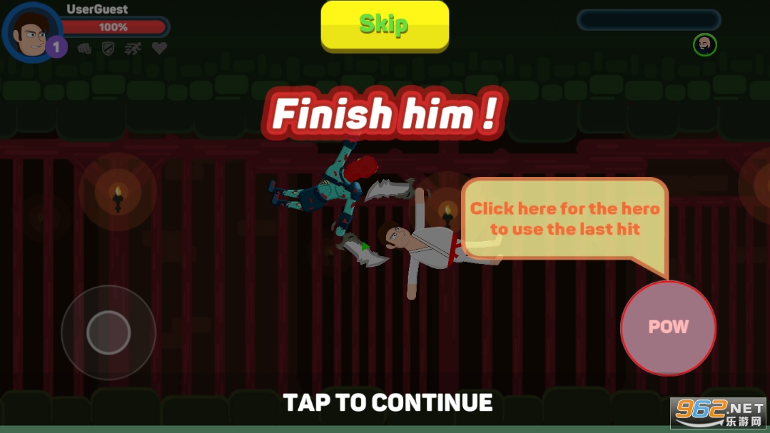 当敌人的血量为零时,玩家可以通过点击右侧屏幕上的“Pow”按钮来使用最后一击。巨力一击,让对方肉肉融化