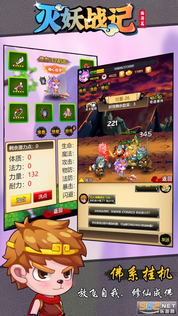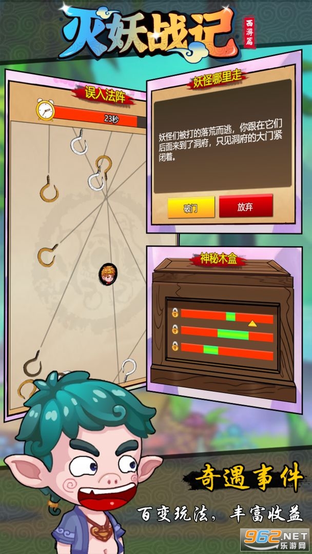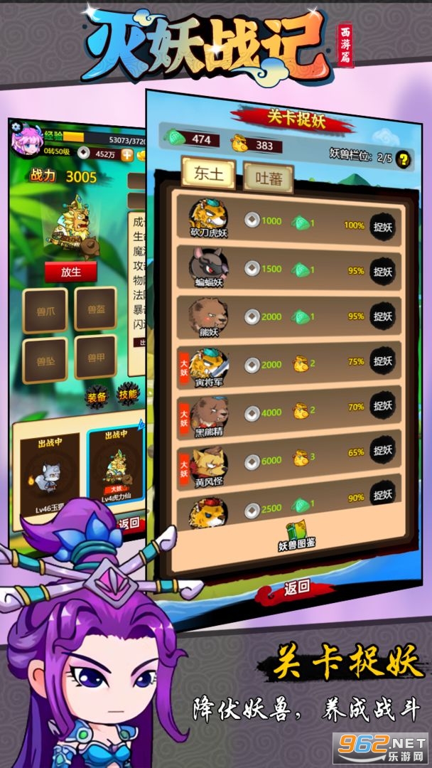 这是一款休闲多元素的挂机游戏,颠覆了传统无脑挂机,还原了西游取经路线上的经典妖怪,上百关卡、几十种简单又新奇的奇遇事件等你来探索,更有多达92种妖兽等你来抓捕!修仙、捉妖、阎卡、庄观、龙宫、闯关、七圣、妖兽属性加成等,更多新奇玩法尽在灭妖战记。