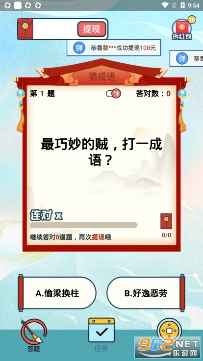 一款轻松好玩还能学习成语知识的游戏,最关键的是在学习中能收获超多的红包福利,参加各种成语关卡挑战,如果你的成语知识积累得很不错的话,可以尝试着去挑战更难的玩法关卡,这样我们就能拿到更多的红包。