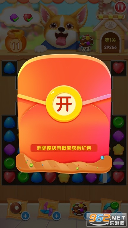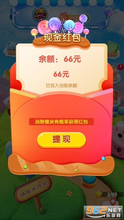 《全民糖果消》是一款轻松消除糖果赚钱的休闲游戏,利用好你琐碎无聊的时间,来这里玩全新的糖果消除吧,手指点点滑动就能消除糖果,疯狂消除满屏特效非常酷炫,每次按照要求成功闯关都能随机得到一个红包,红包金额大小都是不一样的,这就要看各位玩家的运气了。