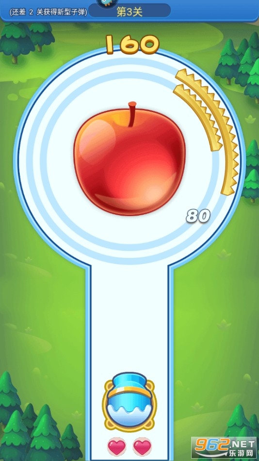 2、每个关卡会有两颗爱心,表示两条生命,只有通过才能进入下一关,并且解锁新水果。