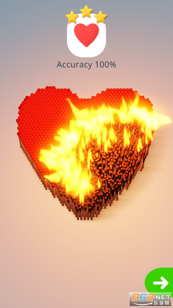 火柴艺术是一款画面清新的利用火柴搭建模型然后烧掉的闯关休闲手游,火柴艺术游戏中,玩家可以利用火柴来组建一些模型,比如苹果、爱心、地球等等,点击屏幕将火柴点燃,看着火柴一点点的烧尽,看着模型一点点的消失。