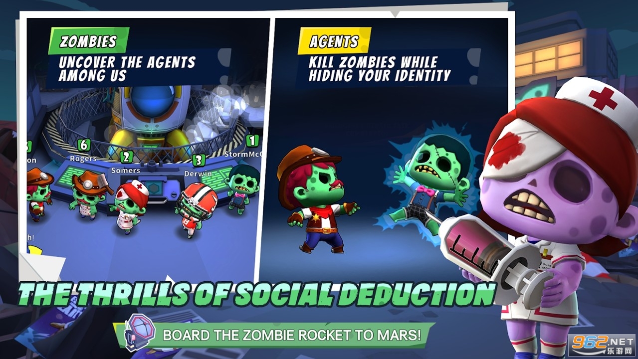 然而,僵尸并不知道,人类特工正躲在阴影中!在破坏任务和消灭僵尸的同时,特工在试图阻止僵尸发射火箭时隐藏了自己的身份。召集会议、通过语音聊天分享信息并投票以发现您中间的特工。小心!那些狡猾的特工可能会发布虚假的地点……当你拼命想弄清楚谁在说真话,谁在撒谎时,你会觉得大脑在燃烧!