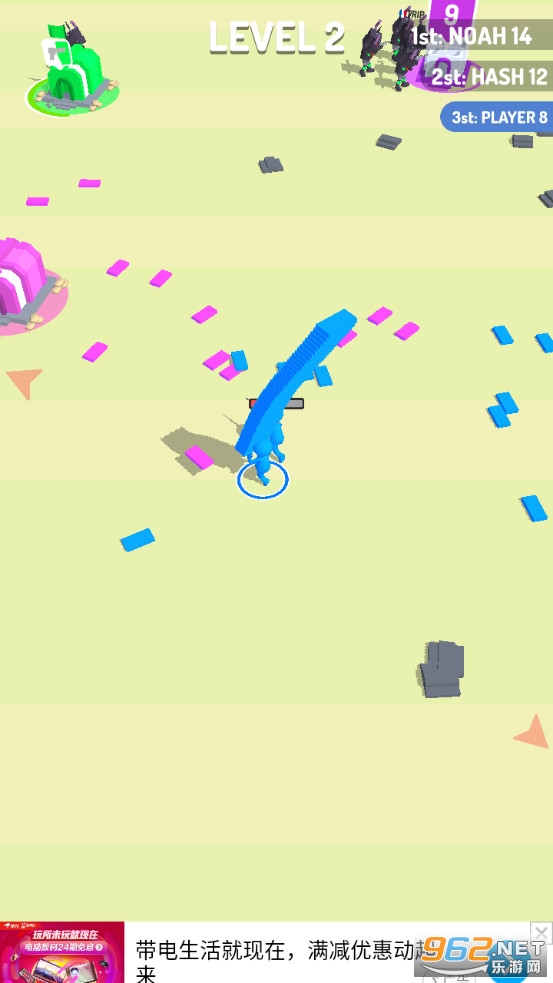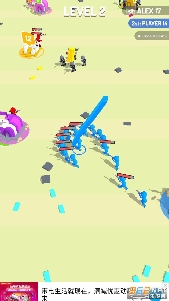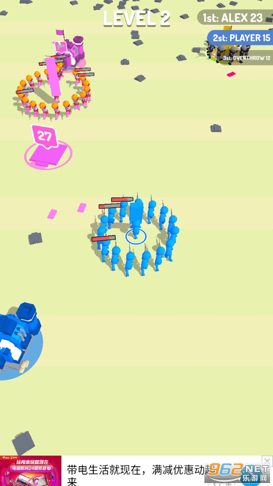 《Stackers.io游戏》是一款画面清新的控制橡皮人去占领一个个基地的射击对战手游,游戏中玩家将控制橡皮人队伍去冒险,选择一个白色的基地作为自己的大本营,然后收集砖块来升级自己的基地,随着时间来生产士兵,增加自己的队伍。