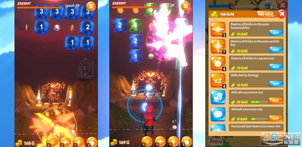 有些砖块有特殊的能力。它们会爆炸或发射激光并在大范围内破坏所有其他砖块