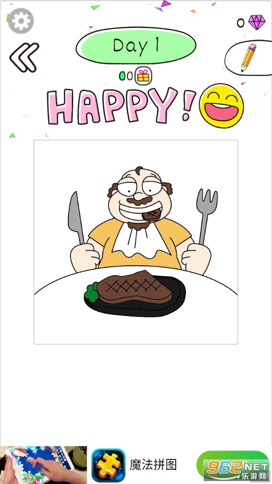 趣味的绘画游戏,玩家需要根据关卡给出的图片来想一想哪一个地方需要不全,比如一个吃牛排的大叔,手上拿着一把刀,那么就还差一个叉子,画出叉子即可,喜欢的朋友可以下载试试。