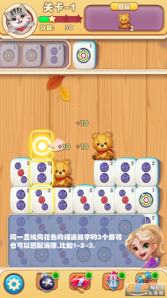 1.在正确的位置上放置麻将,3个相同的麻将会被消除,并且同花色且连续数字的麻将也会被消除。