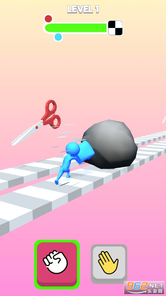 《剪刀石头布3D游戏》(Rock Paper Scissors 3D)是一款画面简约的敏捷变换手势的奔跑手游,游戏中玩家将控制一个角色在各种道路上奔跑,会有着剪刀、石块、木板等各种障碍物挡着你的去路,玩家需要灵活的在石头、剪刀、布之间变换,击毁前方拦路的障碍物,达到终点。