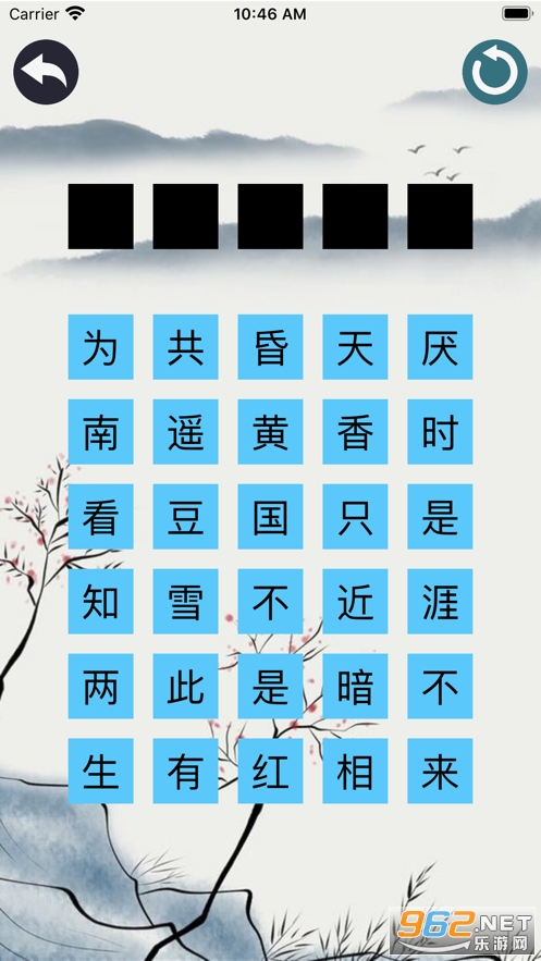 1、每一个关卡都会出现一个5乘以6的方块格子,在其中找到诗词填充就行;