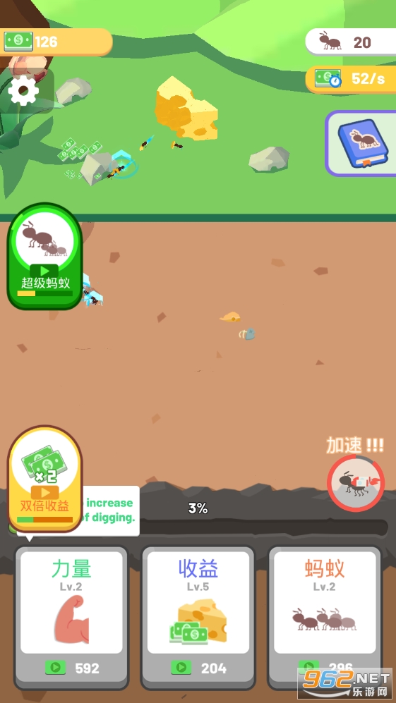 《沙蚂蚁农场中文版》是一款非常有趣的蚂蚁农场游戏,游戏中玩家们需要不断的生产蚂蚁来运输各种食物建造属于自己的地下蚂蚁王国,玩家们可以自由的升级三种不同的属性,根据属性的不同会产生不同的玩法流派哦
