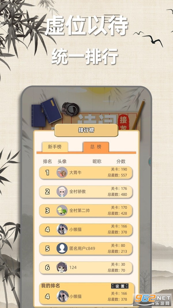 一款采用了词语接龙玩法的成语游戏,在这里玩家将挑战各种有趣的关卡,探寻中华博大精深的成语文化,在寓教于乐的氛围中学习知识,借鉴了传统成语接龙的玩法,使得毫不相干的一些成语连成一组题目,你需要填满这些串联在一起的成语,同时还结合了古代加官晋爵的体系,让用户在学成语,提升知识的同时体验一番金榜题名功成名就的感觉。