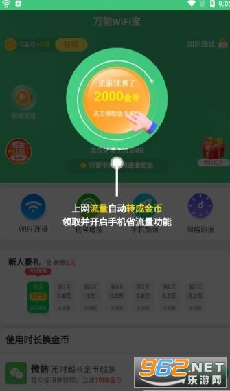 4、上网流量自动转化成金币,领取金币并且开启手机省流量功能更